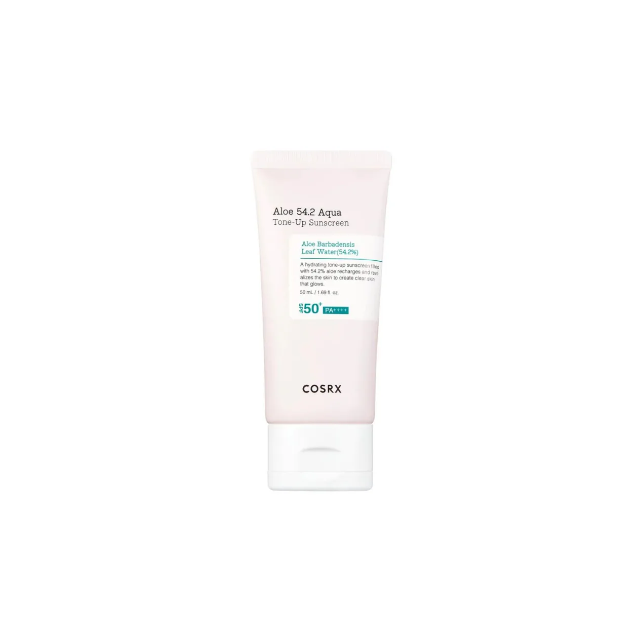 Cosrx Aloe 54.2 Aqua Tone-Up Sunscreen SPF50+/PA++++ apsauginis kremas užtikrina aukštą apsaugą nuo saulės.