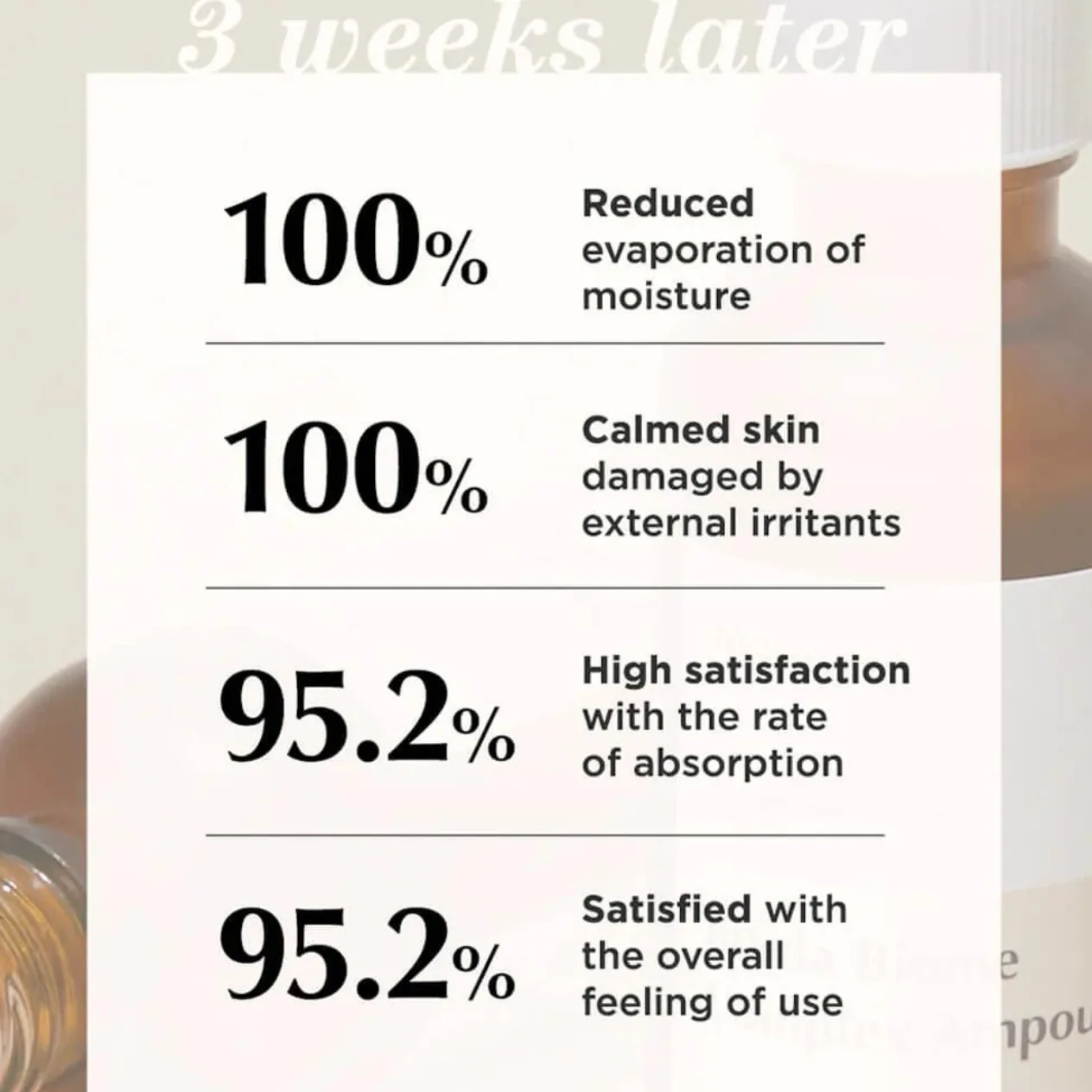 Dėka ampulės sudėtyje esancių bifidobakterijų ir probiotikų komplekso, oda tampa atspari išoriniams veiksniams, atsistato jos drėgmė, sumažėja odos pigmentacija, veido oda pasidaro švytinti bei elastinga.