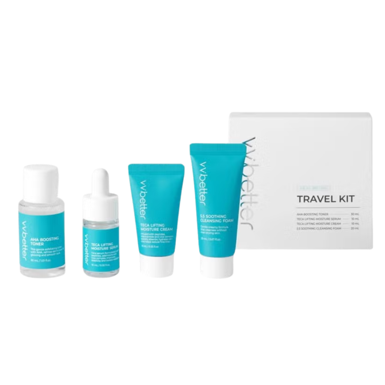 Kompaktiškas Vvbetter kelioninis odos priežiūros rinkinys, sukurtas patogiai kasdienei odos rutinai namuose, kelionėse ar sporto metu. Rinkinį sudaro 4 esminiai veido priežiūros žingsniai, padedantys palaikyti švarią, sudrėkintą ir subalansuotą odos būklę bet kurioje situacijoje.
