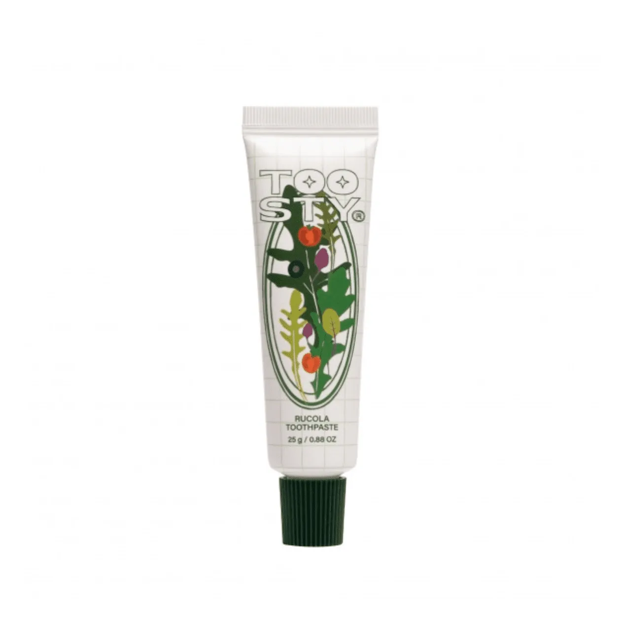 Toosty Rucola Toothpaste mini – tai kelioninio dydžio dantų pasta, kuri padeda nuvalyti dantų paviršių ir suteikti burnai švaros pojūtį, kartu pasiūlydama neįprastą, žolelių–rukolos įkvėptą skonį.
