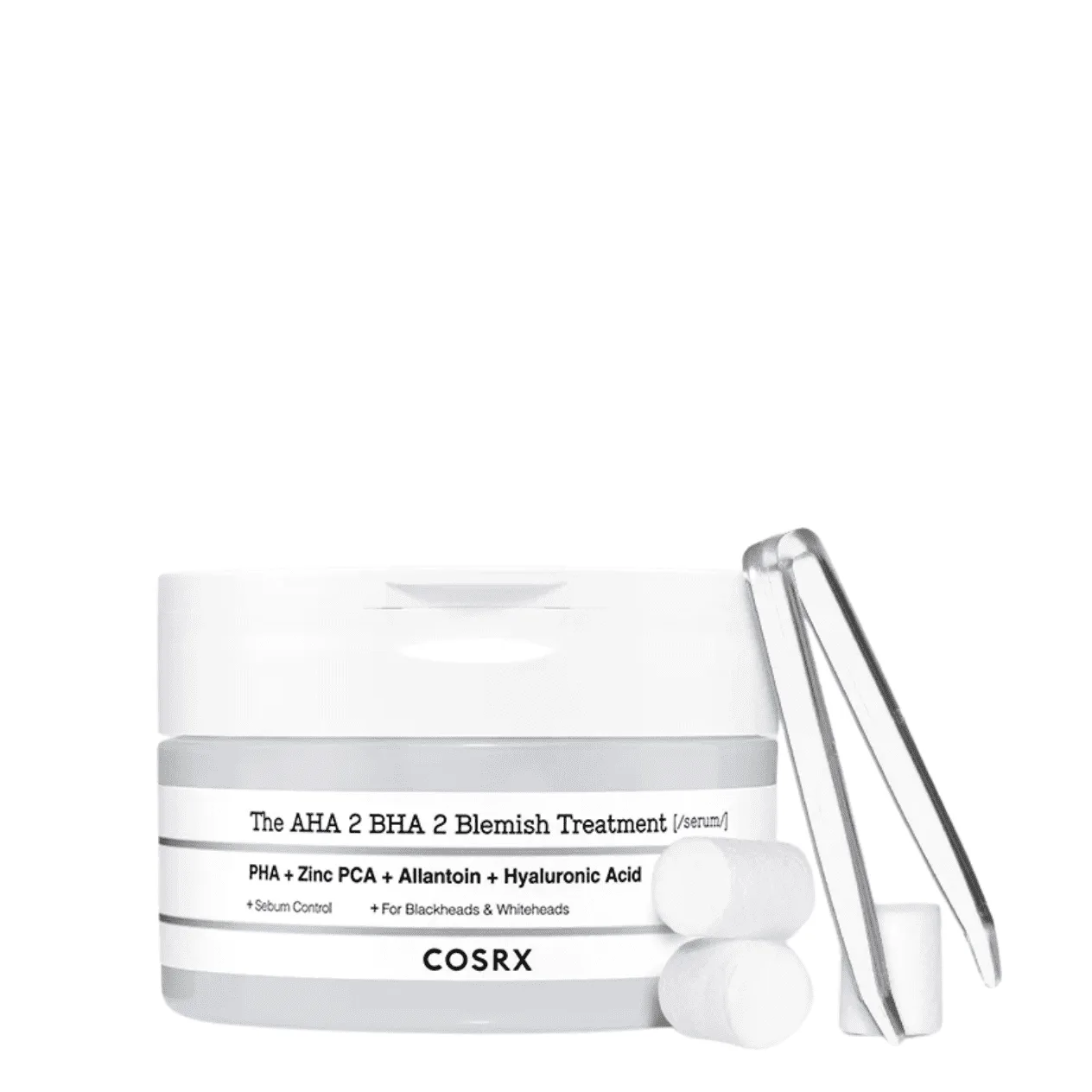 COSRX The AHA 2 BHA 2 Blemish Treatment Serum – tai lokalaus poveikio serumas su 2 % AHA (glikolio rūgštimi) ir 2 % BHA (salicilo rūgštimi) prisotintose medvilninėse „vatytėse“. Švelniai eksfolijuoja, padeda greičiau mažinti spuogelius, inkštirus, užsikimšusias poras ir po aknės likusius pėdsakus, ramina paraudusią, į aknę linkusią odą ir palieka gaivų, nelipnų pojūtį.